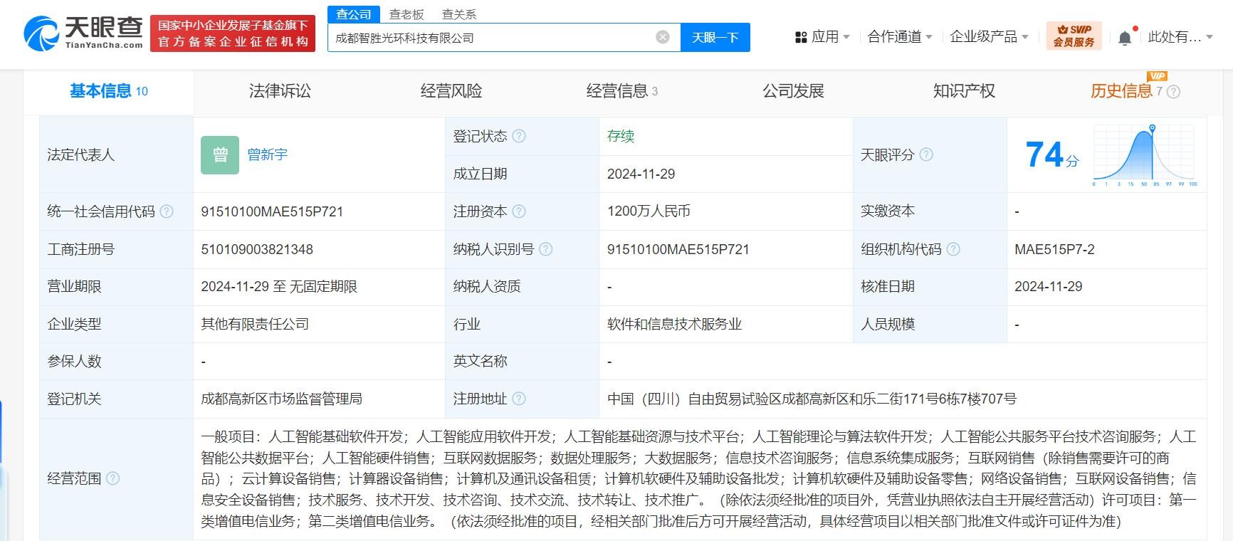 天眼查App显示,近日,成都智胜光环科技有限公司成立,法定代表人为曾新宇,注册资本1200万人民币,经营范围含人工智能基础软件开发、人工智能应用软件开发、人工智能基础资源与技术平台、人工智能理论与算法软件开发、互联网数据服务、数据处理服务、大数据服务、信息技术咨询服务、信息系统集成服务、互联网销售等。股东信息显示,该公司由川大智胜(002253)、光环云(上海)数据科技有限公司、共青城光环壹号投资合伙企业(有限合伙)共同持股。