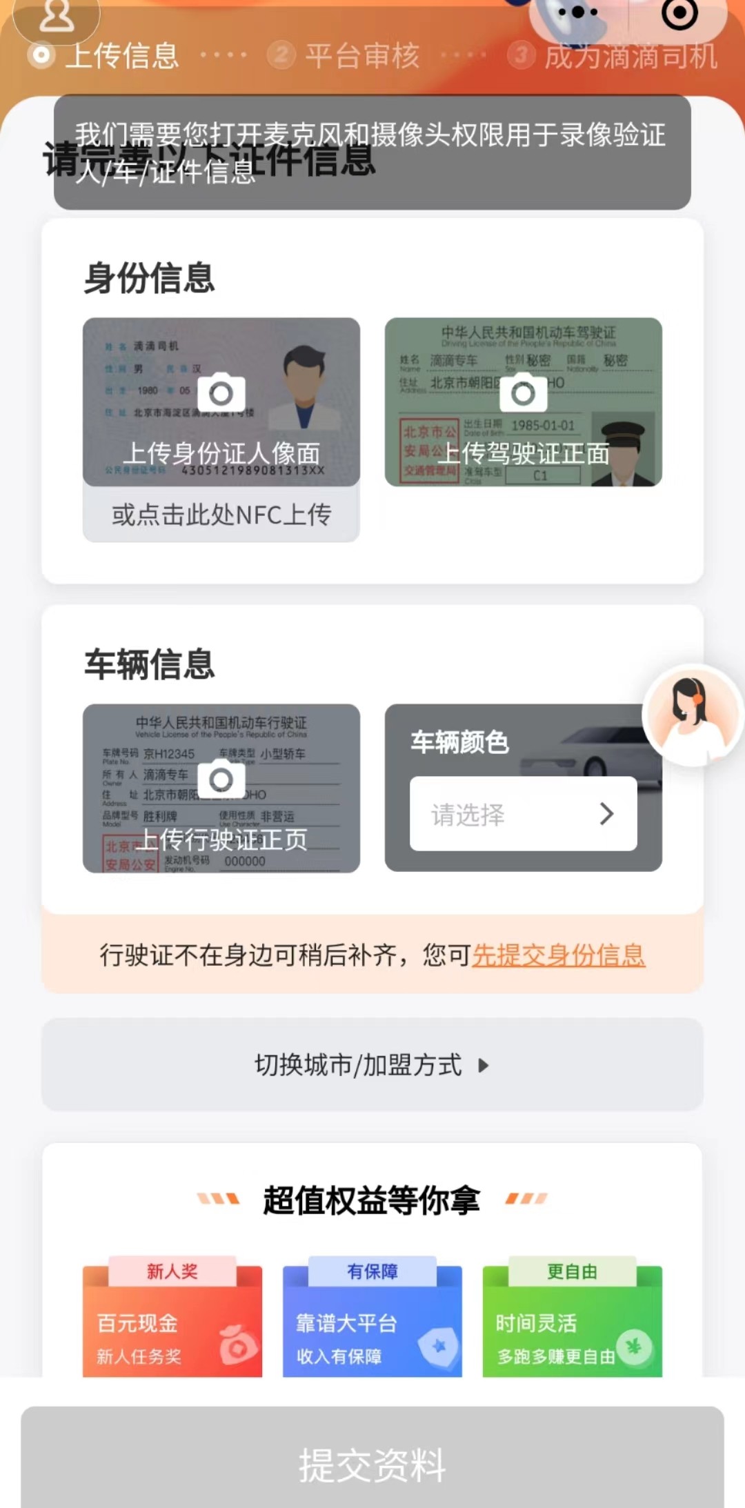在下载了滴滴司机端APP后,接下来需要按照系统的提示提交相关的资料,包括: