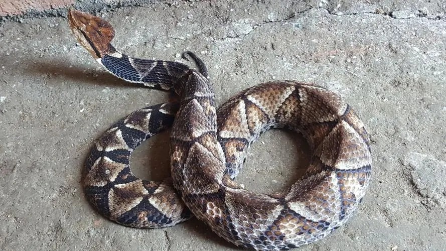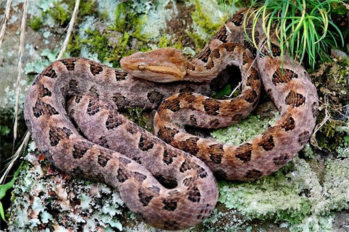 五步蛇的官方名称叫尖吻蝮,有的地方也叫它百步蛇、白花蛇或蕲蛇等,是蝰科尖吻蝮属下的单一物种。这种毒蛇广泛分布在我国长江以南的大部分地区,偏好潮湿、阴凉环境,通常栖息在海拔 1200 米以下的山区森林和山脚地带。