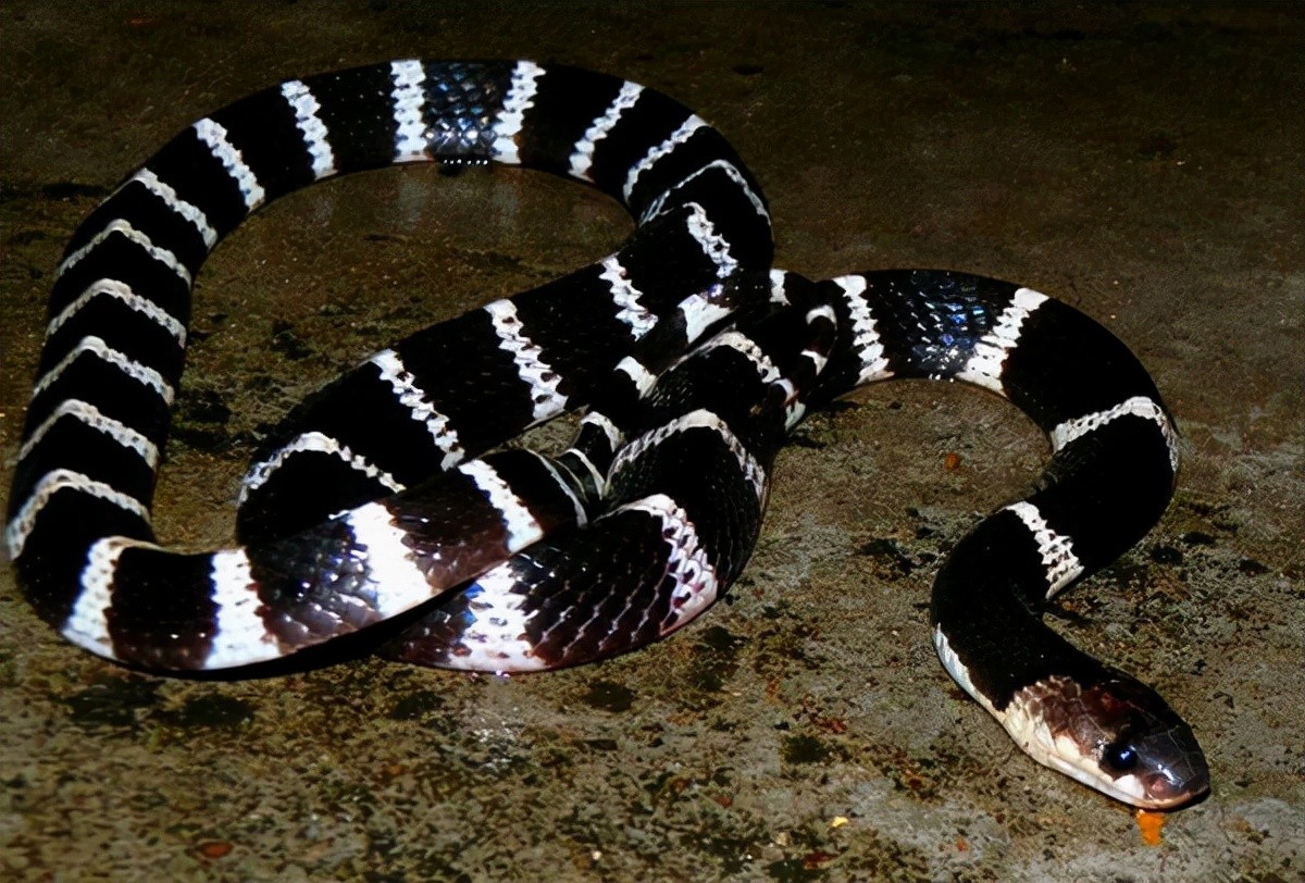 银环蛇又称金线白花蛇,是环蛇属的一种蛇类,在中国长江以南大部分省区均有分布,喜欢栖息于海拔 0~1500 米的山区、丘陵、平原等地带的多水之处,常在夜间活动。虽然活动时喜欢独居,但在冬眠的时候有群居现象,而且经过观察者发现,这种蛇还有着较强的自残性。