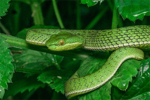 竹叶青是一种体型娇小的剧毒蛇类,主要栖息在中国南方地区,如四川、贵州、云南、广东、广西等省份。这种毒蛇一般体长在 60 厘米至 90 厘米之间,拥有艳丽夺目的翠绿色外表,头部呈现出典型的三角形,眼睛圆润且瞳孔呈垂直椭圆形。其身体表层覆盖着光滑的鳞片,背部有一条格外显眼的绿色条纹,两侧还伴有淡黄色或白色的条纹,外形极为引人瞩目。