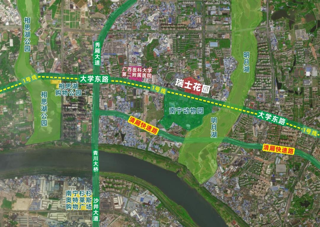 瑞士花园位于南宁市西乡塘区大学东路160号,南宁市动物园的正对面。这个地段,如今属于西大商圈附近,地铁1号线动物园站就在小区门口。是名副其实的地铁盘,周边也早已开发成熟。