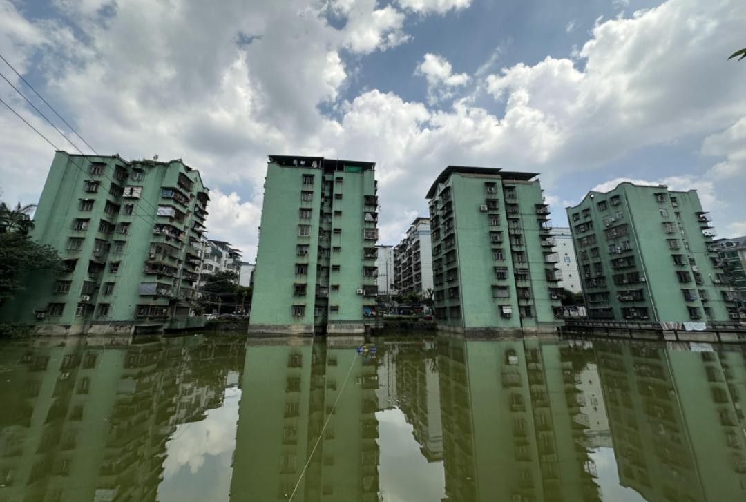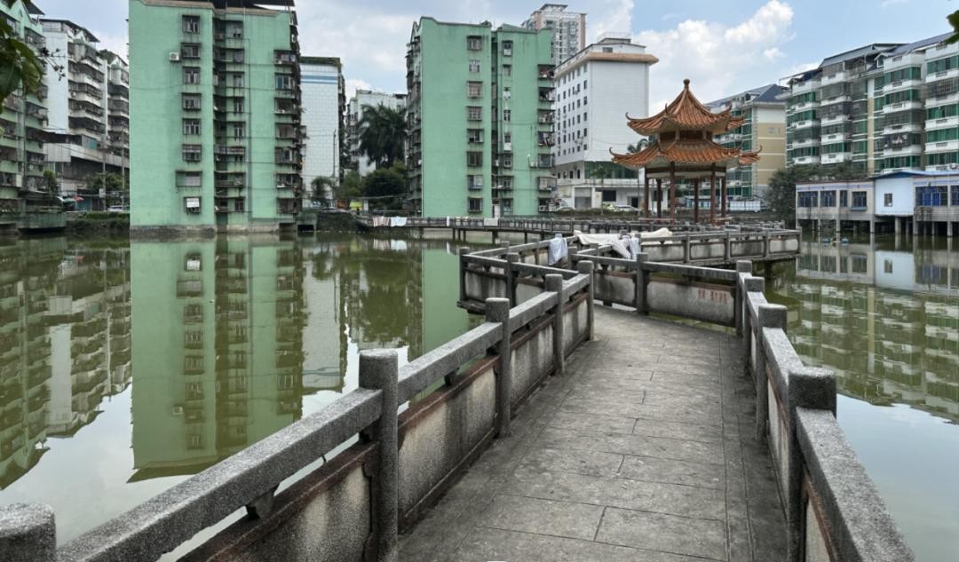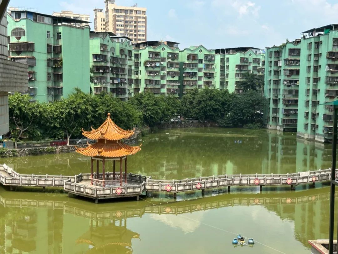 这个人工湖的面积很大,湖中央有凉亭和连接外边的廊桥。在90年代初期,能建这么大的人工湖,挺不可思议的。因为人工湖的物业维护成本极高。而美丽看到,小区还有不少楼栋直接“泡在”了水里,这就更离谱了。