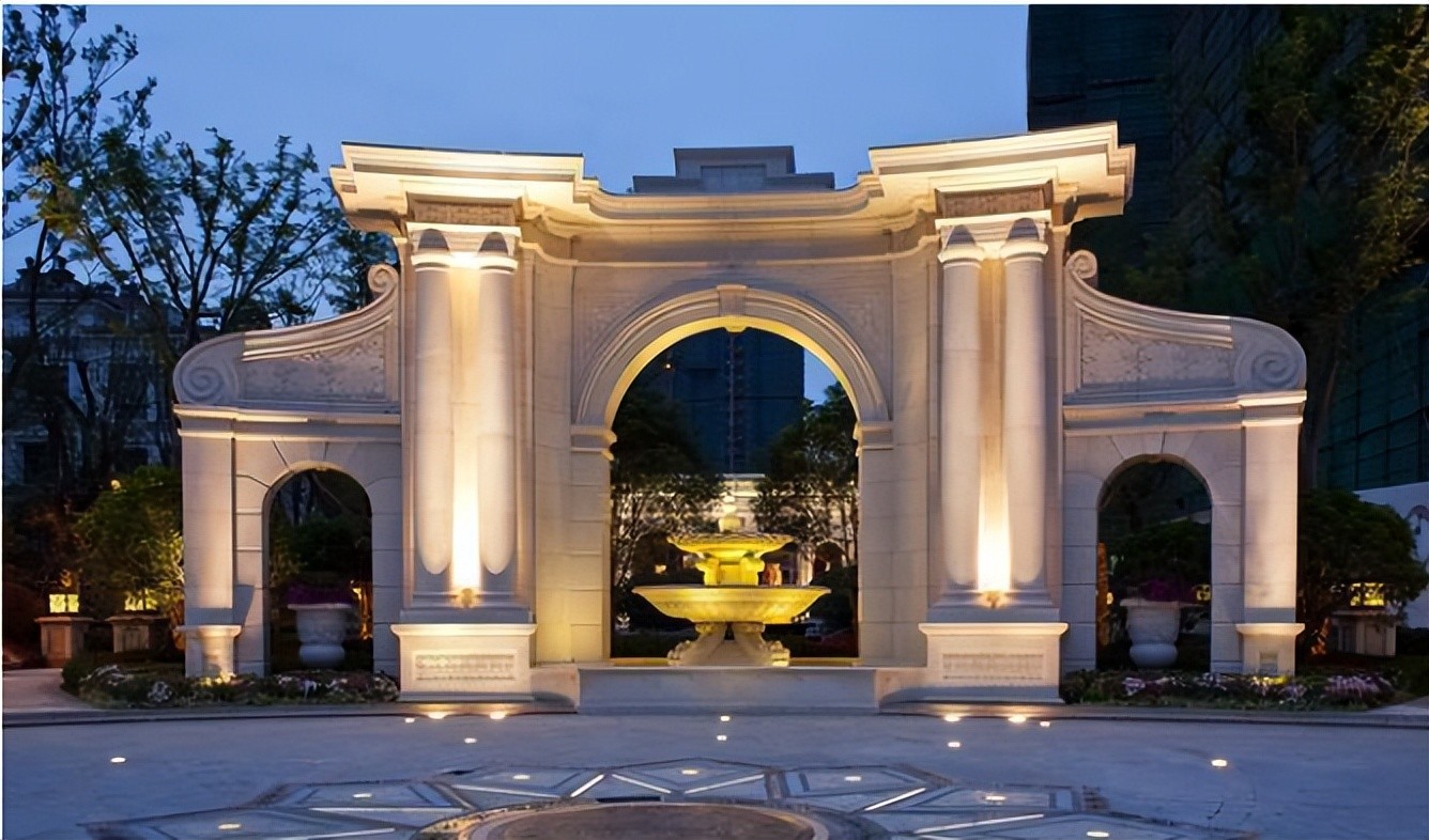 可以想象,当年开发商为了省成本,欧式大门的拱门变成了方门,浮雕、雕塑等装饰物全部不要了,甚至就连喷泉也只是修建了一个喷水池而已。