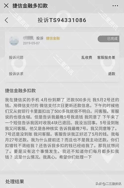 张先生还提供了一些客户在网上投诉捷信的资料,资料中显示,在今年四五月份,无论是在捷信做的贷款还是手机分期业务,依然存在着多扣用户费用的现象,虽然资料中有的显示已经处理完毕或是结案,但是用户都表示出了强烈的不满。