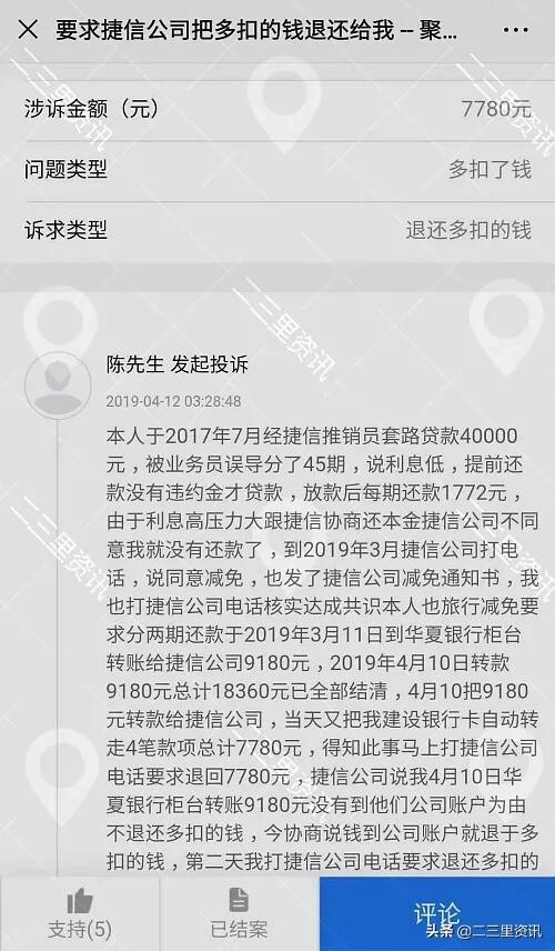 二三里资讯先期报道的捷信金融私自截扣朝阳用户380元的事件在12日得到了解决,但是投诉人张先生却是很不满意。
