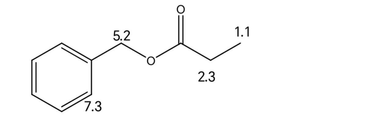 例3:化合物分子式为C10H12O2,其1H NMR谱图数据如下:7.3(s, 5H),5.2(s, 2H),2.3(q, 2H),1.1(t, 3H)。试推断其结构。
