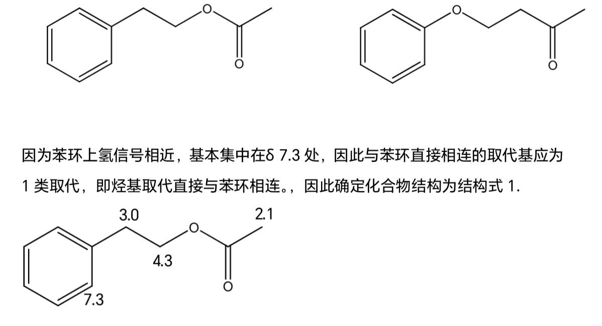 根据上述官能团信息,可以判断结构中含有单取代苯环、-OCH2CH2-、-CH3,氢谱中甲基的化学位移为δ 2.1,且分子式中还有剩余一个氧原子,不饱和度也剩余1个,推测甲基与羰基相连。综上,推测化合物结构如下两种情况