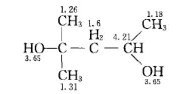 有个d峰的甲基,说明邻位连有次甲基,而氢谱中只有一个连羟基的次甲基;同理说明亚甲基与该次甲基相连;因为亚甲基的耦合裂分情况,知道相邻还连有一个季碳原子,而剩余一个羟基和两个单峰甲基均与该季碳相连,综上,推测化合物结构如下: