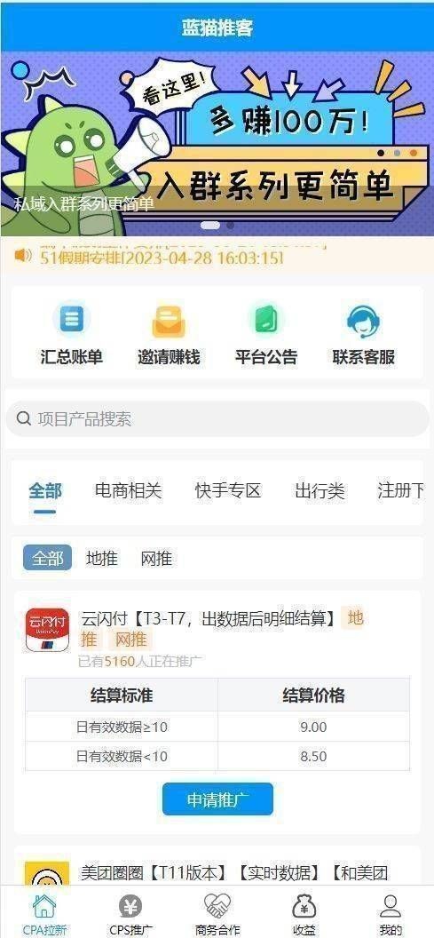 蓝猫推客我认为是比较又潜力的平台,经过几天测试数据和结算都是比较稳定的,项目也多,几乎包含了大部分的地推和网推项目