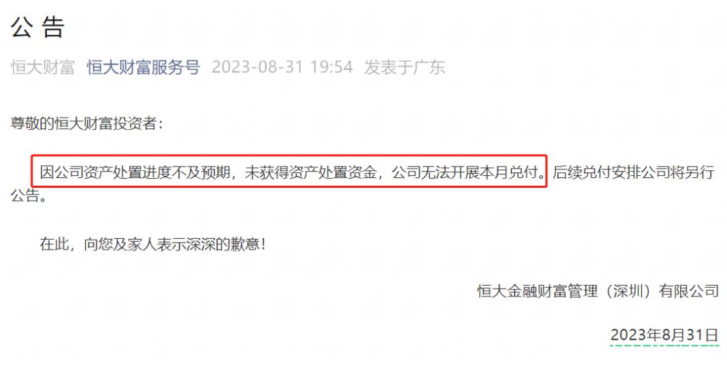 就在 16 天前,8 月 31 日晚间,恒大集团旗下恒大财富微信公众号发文称,因公司资产处置进度不及预期,未获得资产处置资金,公司无法开展本月兑付。后续兑付安排公司将另行公告。