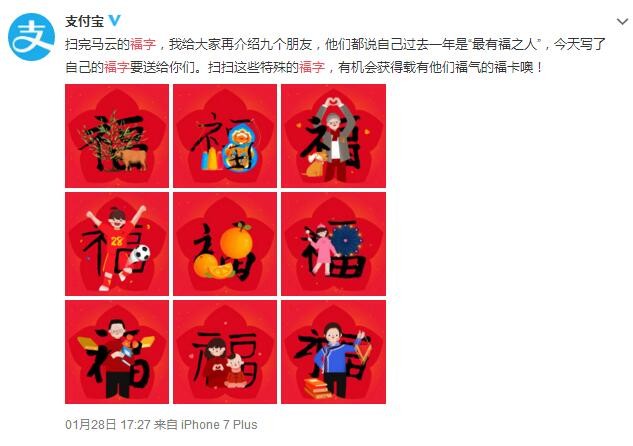 上面这些福卡小编可是亲自扫了的,连扫八张福卡,也许大家就能扫到敬业福和花花卡呢?没扫到也没关系,小编为大家整理了马爸爸写的福字,来一张沾福气卡,去沾沾好友的福气吧!