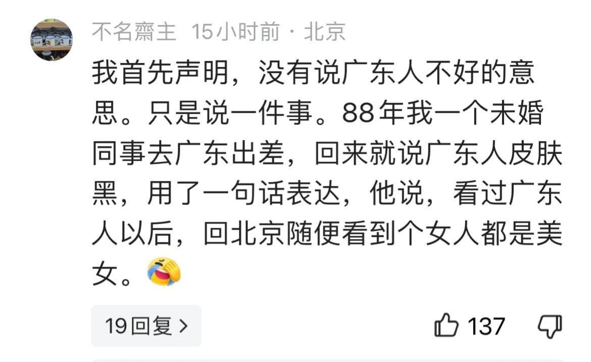 这是一个来自北京网友的评价:他说广东人皮肤黑,然后说自从88年出差看过广东人以后,在北京随便看到一个人都是美女。这个朋友怕是还把对两广人的记忆停留在88年的时候,五官啥的不说吧,至少很少黑的了,大家都会注意防晒了。