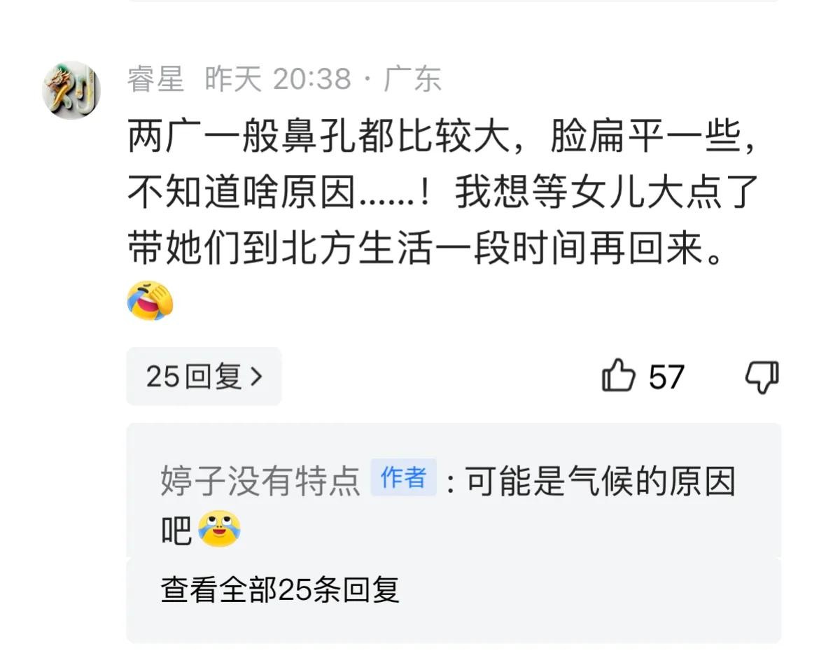 这是一个来之广东朋友的自我评价:两广的鼻孔一般比较大,脸扁平一些,不知道啥原因,说他想等他女儿大点了带她们到北方生活一段时间再回来。难不成在北方待一段时间就会变漂亮了吗?这是不知道遗传基因的强大吧?