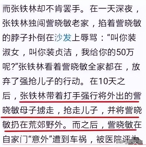 张铁林得知后,迅速冲到訾晓敏娘家掐住她的脖子,逼其将孩子交出来,并对訾晓敏说:“你不就是为了钱吗?装什么纯情?”。