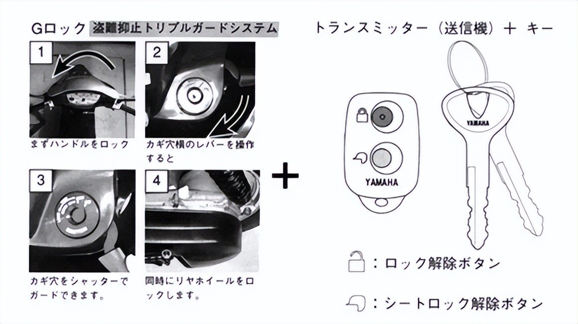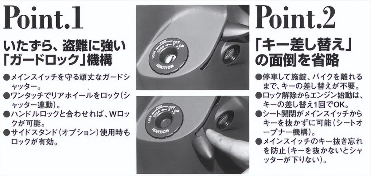 第二个 G 是 G-LOCK。配备钥匙防撬盖,这在当时还是很少见的。同时还配备了车把锁和后轮锁。