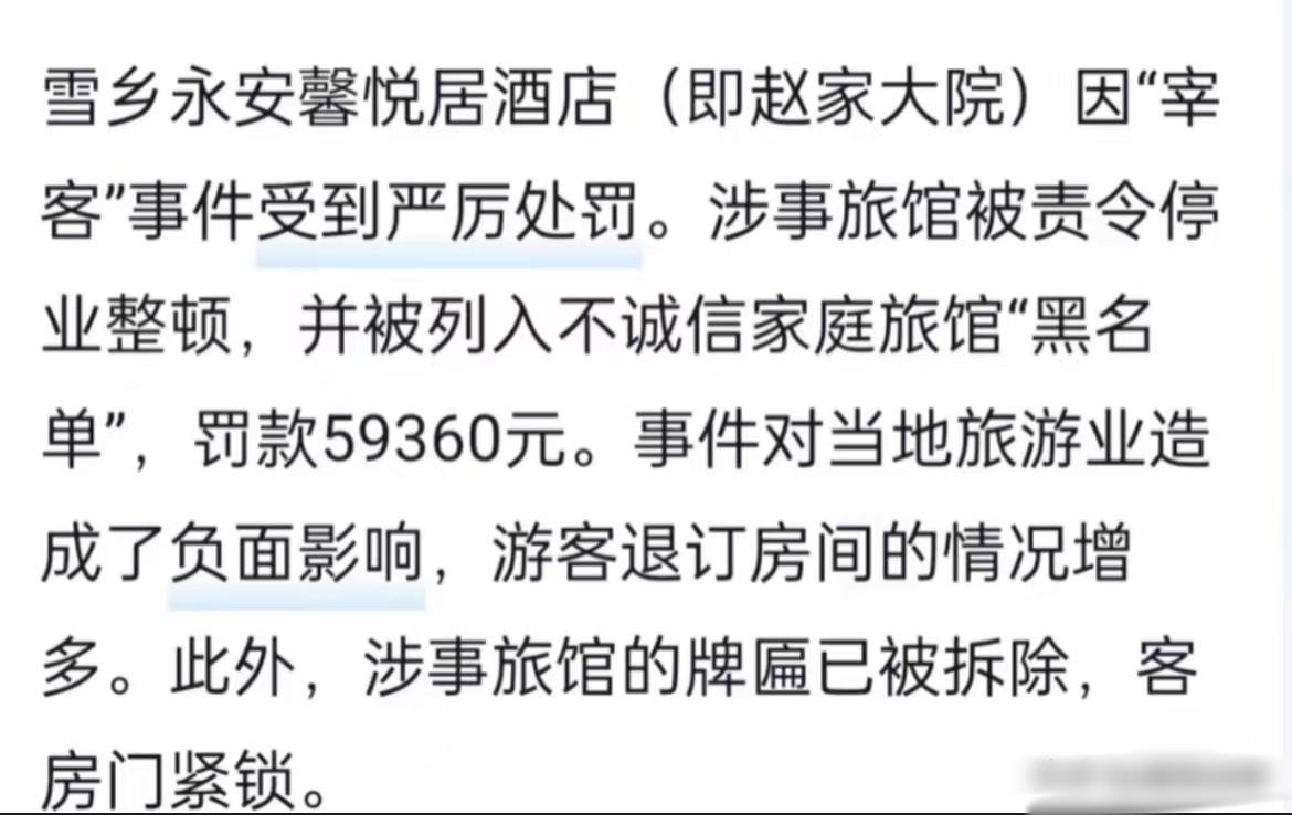 想想看这些不规范的商家利用游客对地方特色的好奇心,设下一个个收费陷阱,真的让人心寒。如果仅仅是价格问题,或许还不至于引发那么大的反响,毕竟旅游市场鱼龙混杂。更让人觉得无奈的是,相关部门的监管往往滞后。雪乡馨悦居酒店此前因类似情形遭过处罚,然而此酒店未就此做出改变,依旧持续招揽游客。