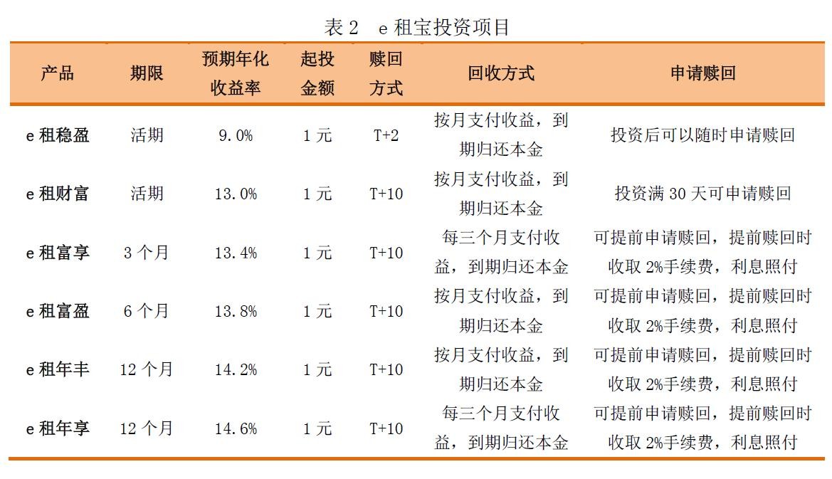 “E租宝”经营模式是由集团下属的融资租赁公司与项目公司签订协议,然后在“e租宝”平台上以债权转让的形式发标融资;融到资金后,项目公司向租赁公司支付租金,租赁公司则向投资人支付收益和本金。