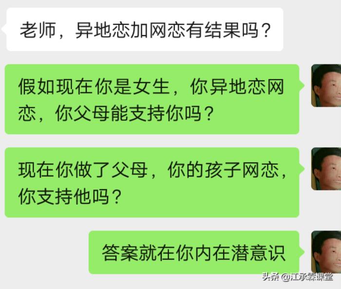 江承霖课堂的承霖老师回答:第一,假如现在你是女生,你异地恋+网恋认识了一个人,你父母支持你吗?