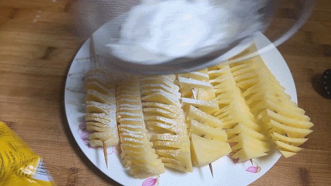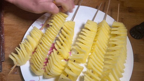 7. 将切好的土豆拉展,全部像这样串好