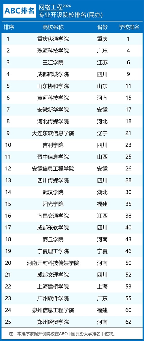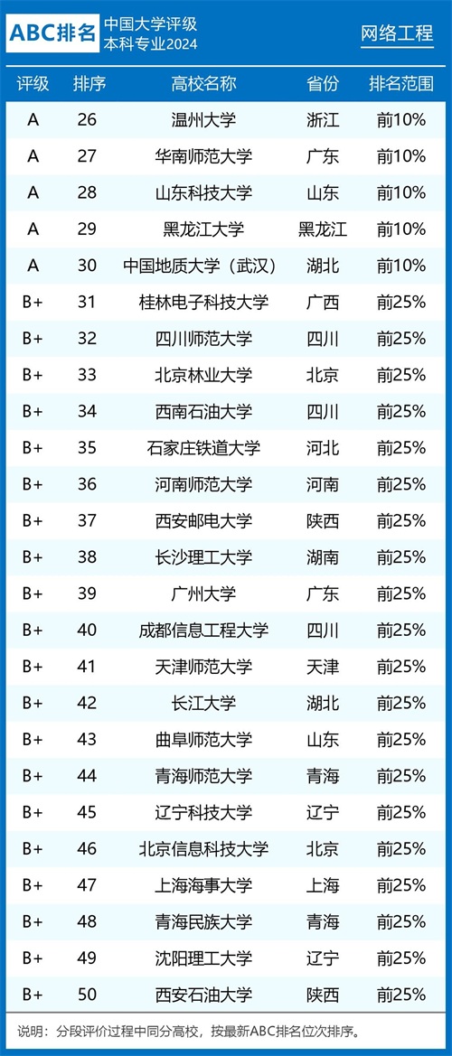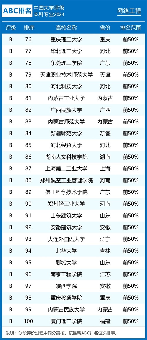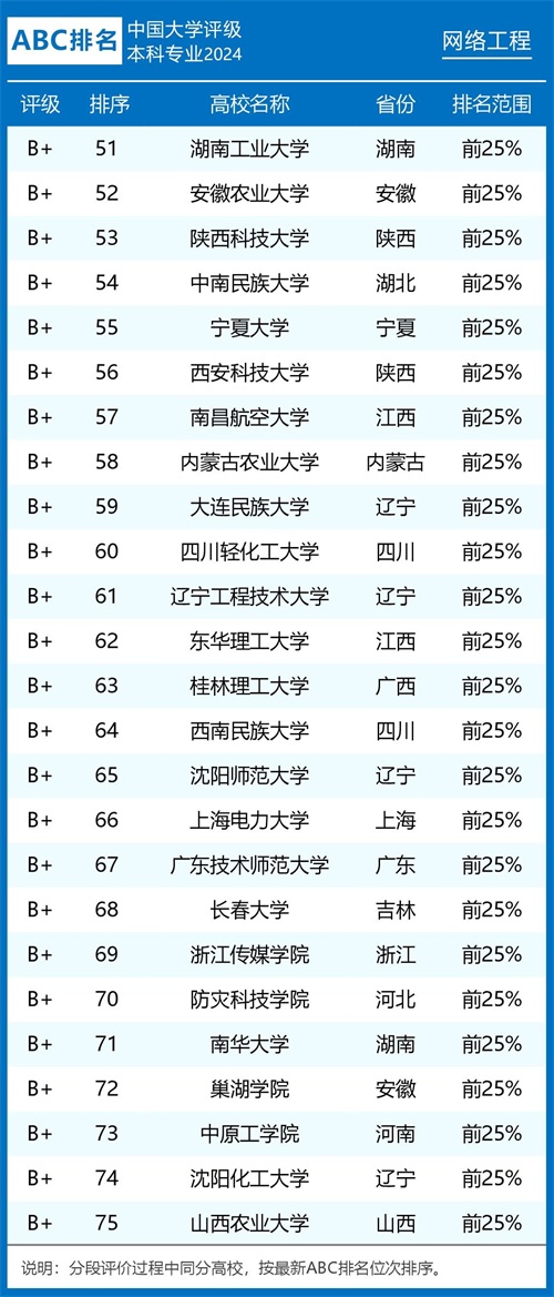 2024年ABC中国大学网络工程专业排名及评级结果显示: