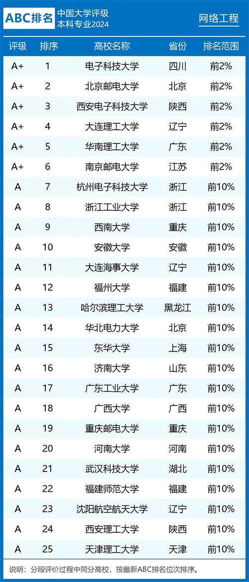 电子科技大学、北京邮电大学、西安电子科技大学、大连理工大学、华南理工大学和南京邮电大学排名全国网络工程专业前六,评级结果为A+。