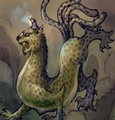 中国古代神兽,人面豹身,牛耳一目,有长尾,能发巨声。行走时衔着尾巴,休息时盘着尾巴。
