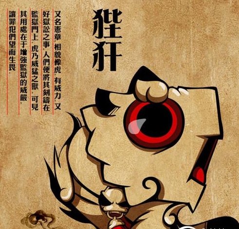 狴 犴,又名宪章,形似虎,是老七。它平生好讼,却又有威力,狱门上部那虎头形的装饰便是其遗像。传说狴犴不仅急公好义,仗义执言,而且能明辨是非,秉公而断,再加上它的形象威风凛凛,囚此除装饰在狱门上外,还匐伏在官衙的大堂两侧。每当衙门长官坐堂,行政长官衔牌和肃静回避牌的上端,便有它的形象,它虎视眈眈,环视察看,维护公堂的肃穆正气。