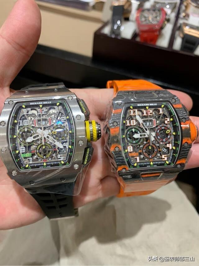 比较好看的酒桶型腕表主要就是理查德和法兰克穆勒,Richard Mille在腕表表盘上下足了功夫,并将复杂结构呈现出最直观的视觉感受。华丽的斜切边缘给予腕表深邃的质感,彩色的飞返计时器表盘和秒针显示窗围绕着中央时间显示。这种量级的冲击力在上桥板中依旧能够得到体现,上桥板由抛光后的5级钛合金制成,与同样使用钛合金但采用PVD涂层的机芯产生鲜明对比。