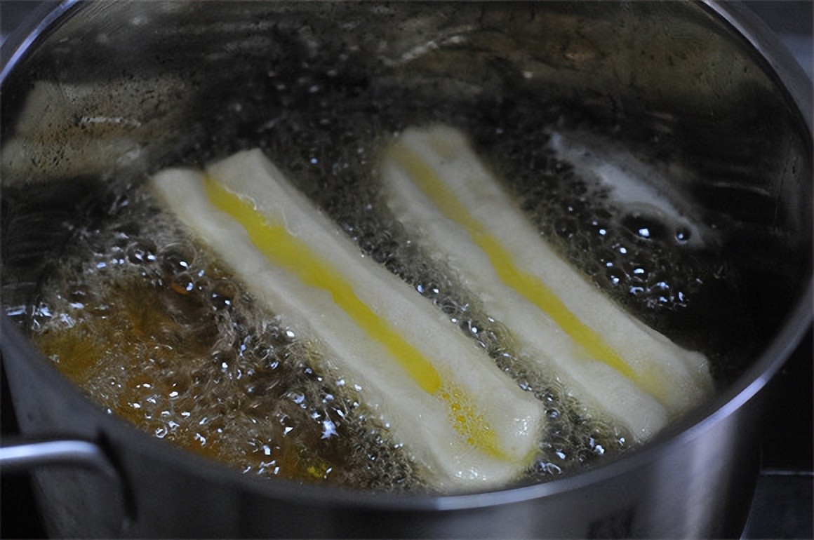 锅中油烧至冒泡,将油条放进去,不停地翻动,让油条每一面都均匀受热,表面炸至金黄就可以出锅了。