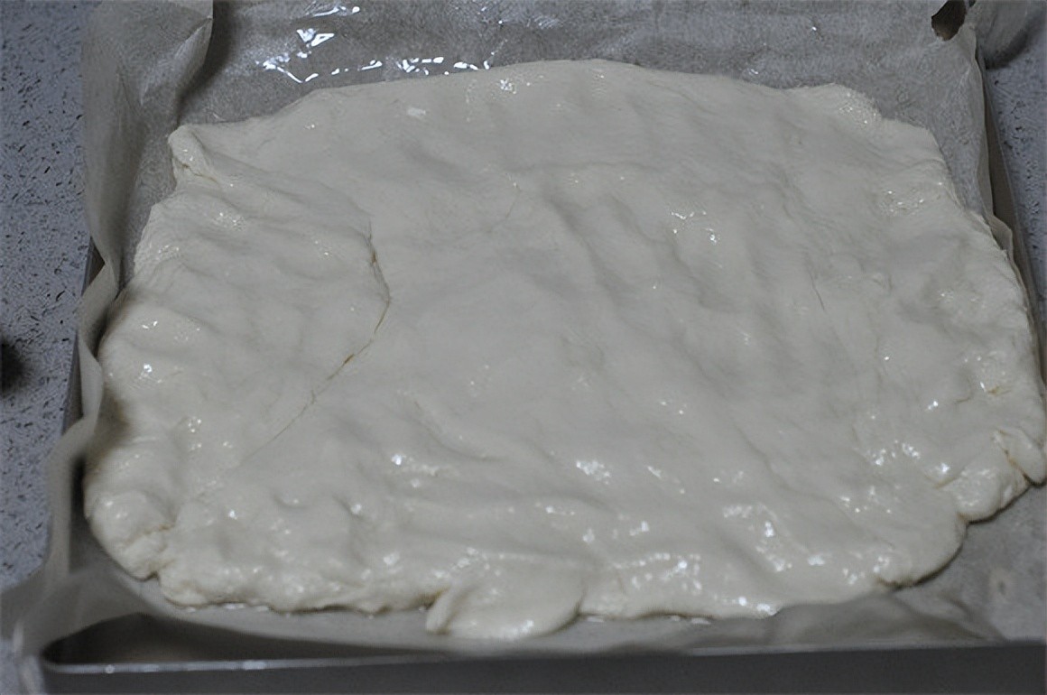 将面团取出来扫少许油,放入铺了油纸的烤盘里,用手慢慢摊平,用保鲜膜覆盖好哦,静置2个小时让面团发酵。