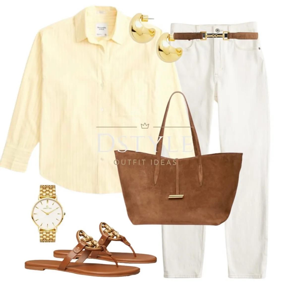 衬衣的直线剪裁尤其适合温柔配色,米黄衬衫配白色牛仔裤,短款衬衣与直筒也能穿得很利落,穿出明媚元气感。