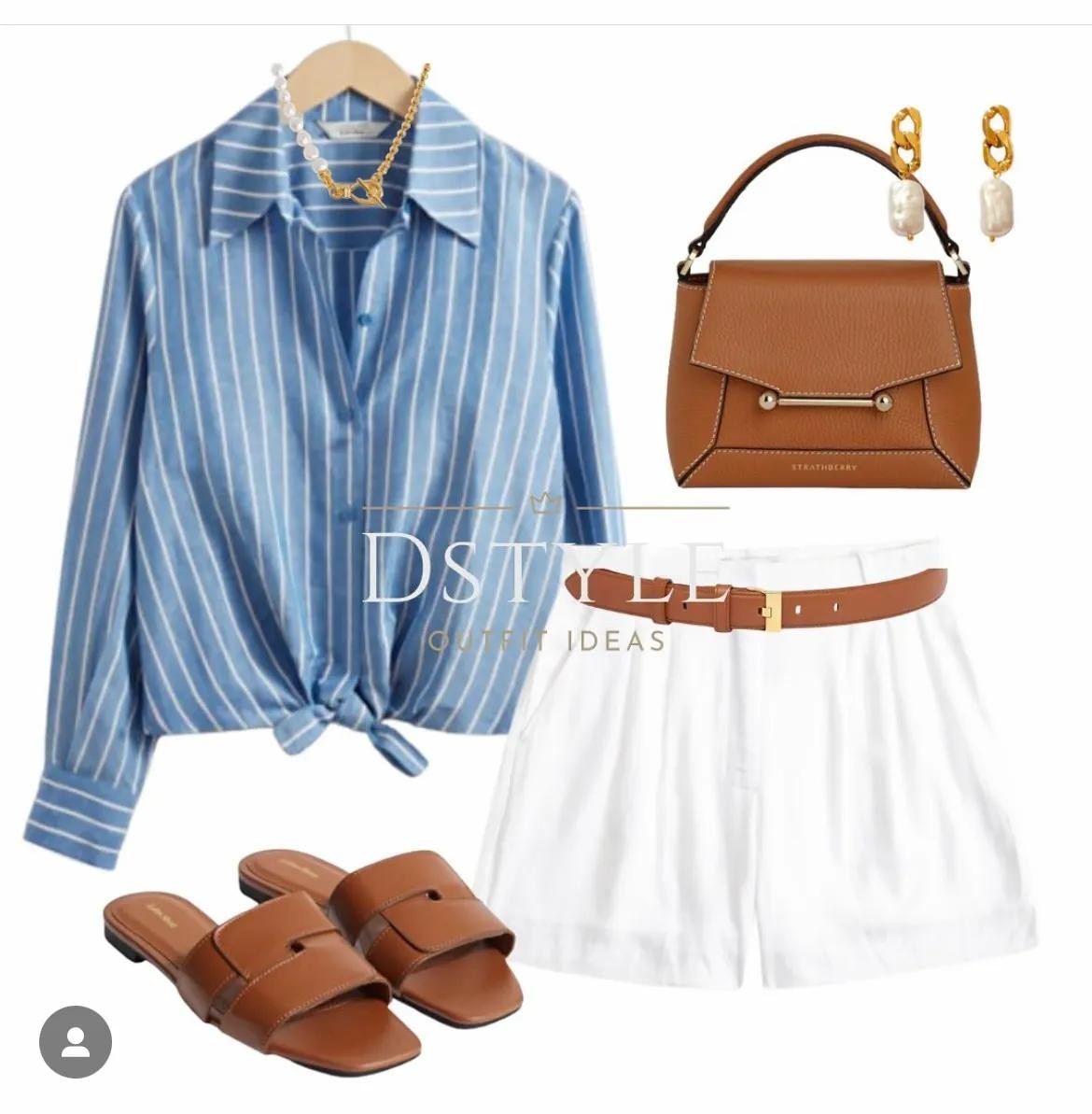 黑白咖三色是职业女性的黄金配色,黑色竖条纹灵动还显瘦,搭条干练白色短裤,再用绒面纹理的尖头鞋和包包点缀韵味,有型又大方。