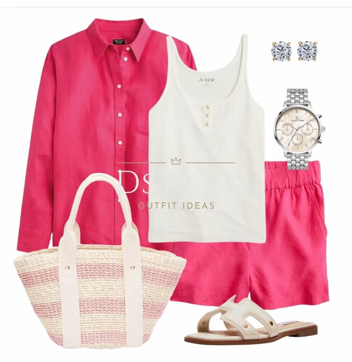 衬衣的清晰线条和小巧版型还很适合甜美感风格哦。水红色遇到棉麻面料,依然是秋老虎来袭时的理想组合,衬衣+短裤的组合穿好几年都不会过时。