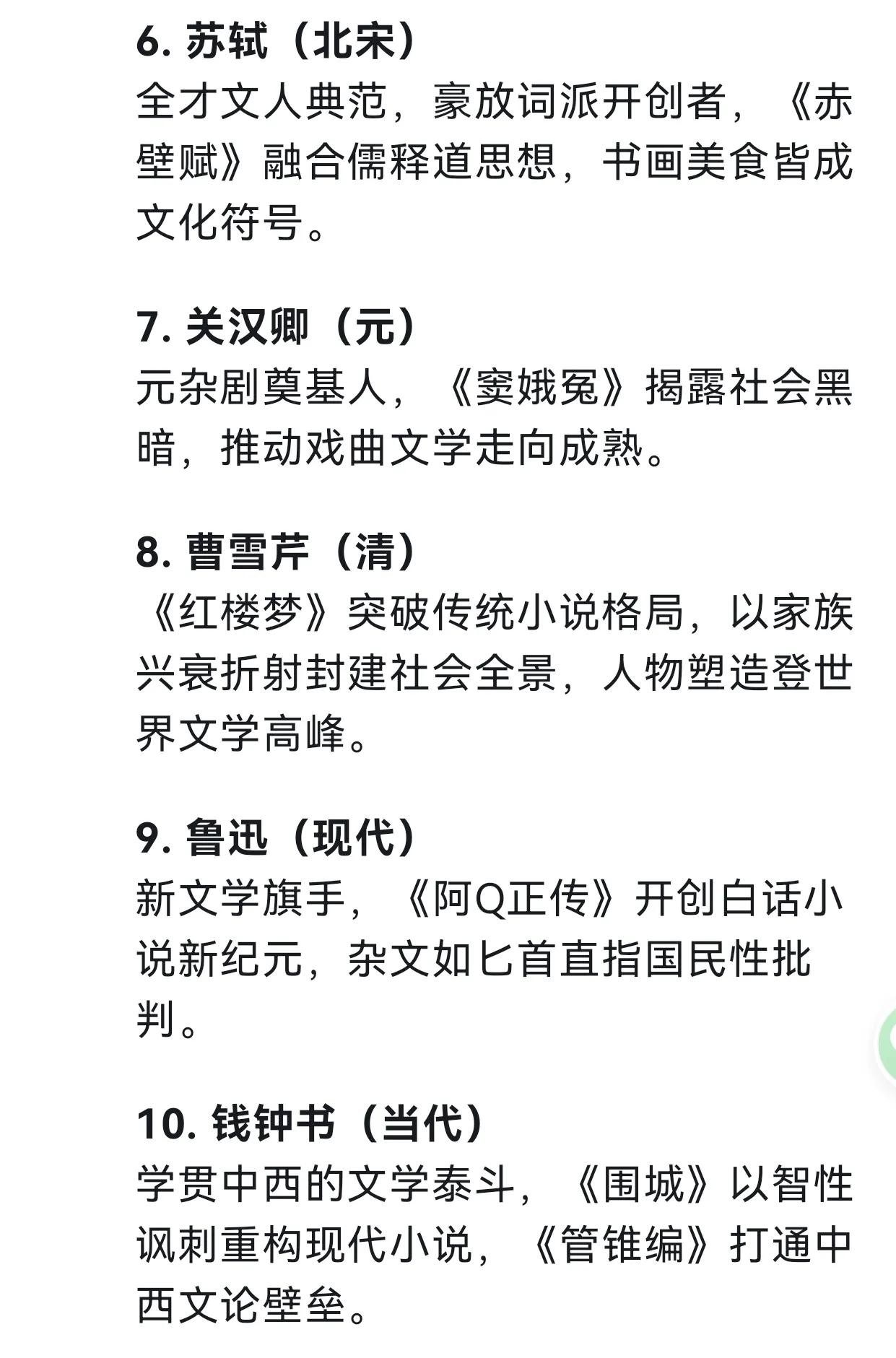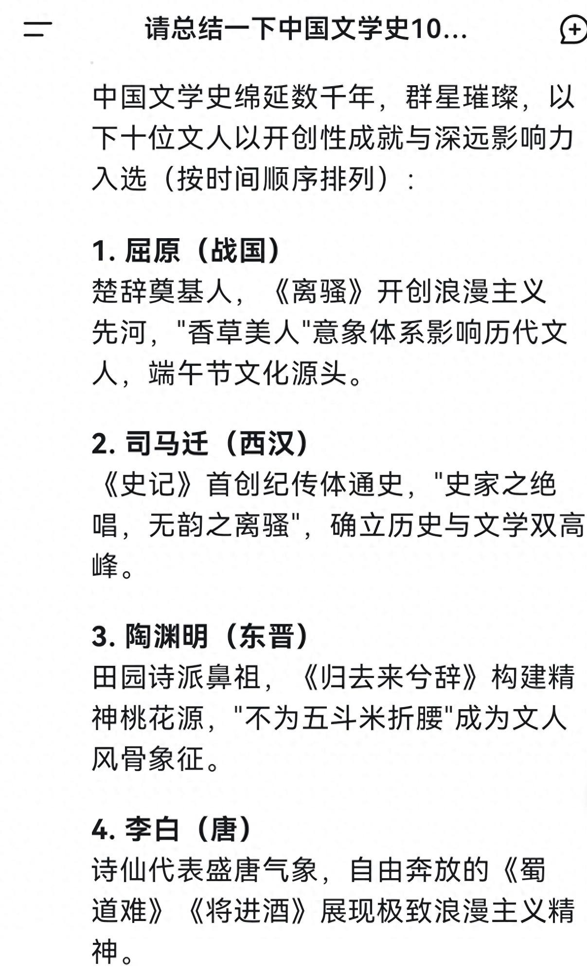 中国文学史上最厉害的10大作家是哪些?Deepseek在做了深度思考后,认为,中国文学史绵延数千年,群星璀璨,能够具有开创性与影响力的远不止10位,比较起来,以下10位更具有代表性: