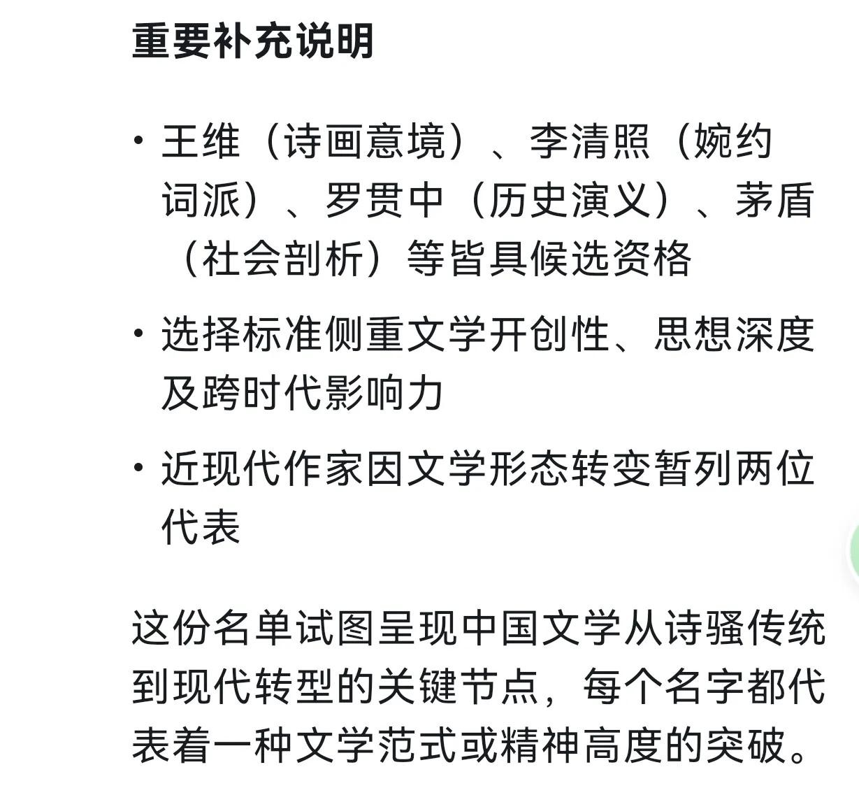 当然,Deepseek也进行了补充,认为王维李清照罗贯中茅盾等皆具有候选资格。