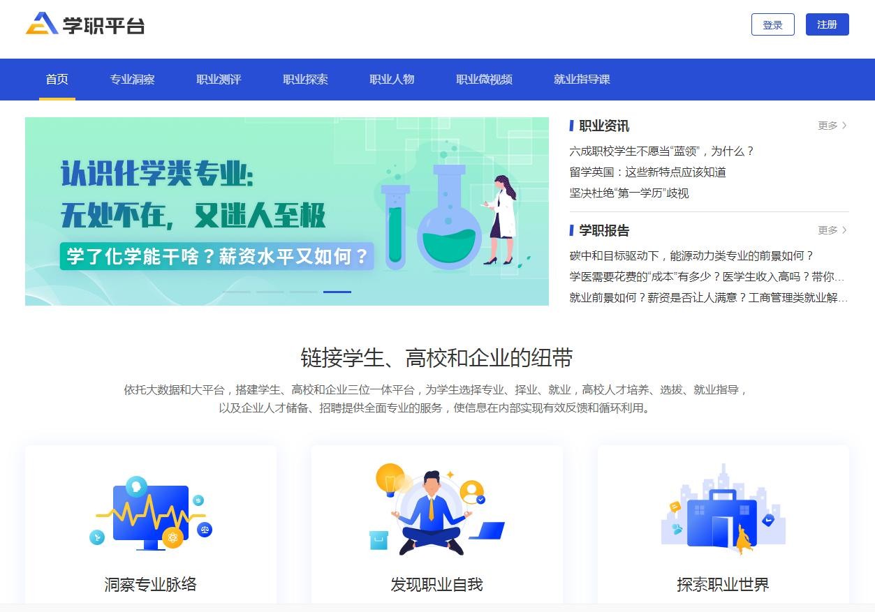 “学职平台”是教育部为学生、高校和企业搭建的三位一体平台,为学生选择专业、择业、就业,高校人才培养、选拔、就业指导,以及企业人才储备、招聘提供全面专业的服务,使信息在内部实现有效反馈和循环利用。