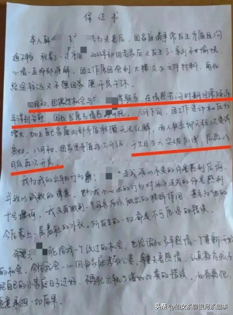 李先生还透露,儿媳韩某面对这样的情况,不得不坦白承认了自己和90后处长出轨的事情,哭求原谅,并手写下了保证书,清楚交代了两人的关系。