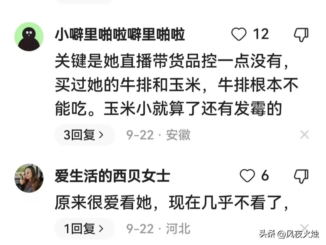 她带货,也受到网友的批评,有些网友说买过她的牛排和玉米,牛排根本不能吃,玉米小还有发霉的。