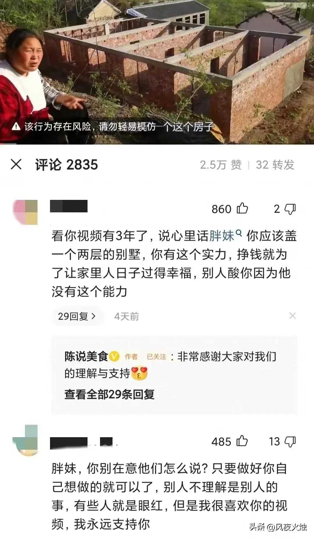 胖妹不得已只好回应,老房子时间太久了,墙皮都掉了,有些地方都开裂了,房子早晚是要重新盖的,自己不当网红,房子也要盖的,挣钱不是为了让家里人生活得更好吗?