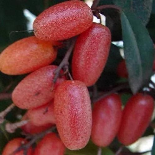 胡秃子果实呈椭圆形,长12一14毫米,幼时褐色的鳞片覆盖,然后由褐色转变为青色、淡红色、成熟时鲜红色。果期4一6月份