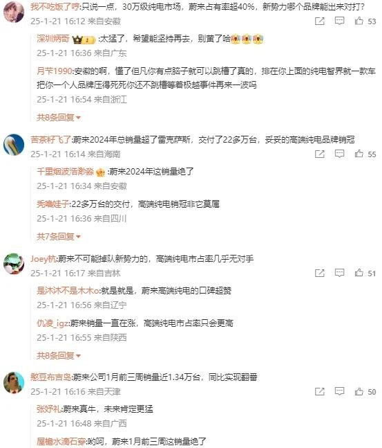 “只说一点,30万级纯电市场,蔚来占有率超40%,新势力哪个品牌能出来对打”、“蔚来2024年总销量超了雷克萨斯,交付了22多万台,妥妥的高端纯电品牌销冠”、“蔚来不可能掉队新势力的,高端纯电市占率几乎无对手”......