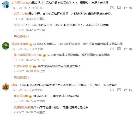 “建议把其它品牌的环比数据也放上来,看看整个市场大盘情况”、“3000多座换电站,25000多根充电桩,怎么没有榜单给基建成果排名呢”......