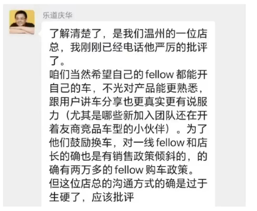 至于乐道总裁艾铁成,对于“乐道订单造假”、“强制乐道员工买车”一事没有发声,反倒是乐道副总裁夏庆华进行回应,表示系店总在推广内购政策时沟通方式欠妥,已予以批评,并痛批网络恶意攻击。