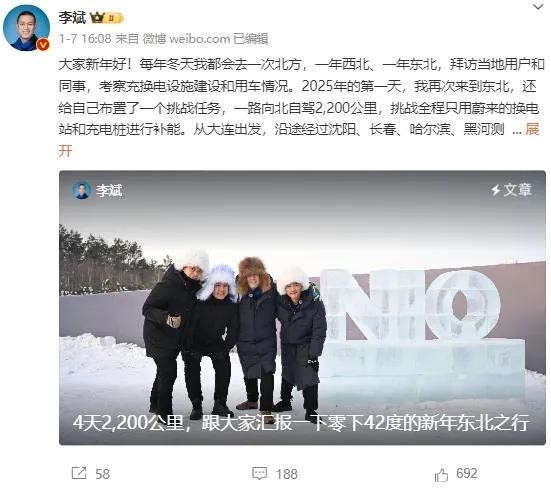 任由网络上盛传各类传闻,李斌正在寒冷的北方进行2200公里全程只用蔚来换电站和充电桩补能的极端测试,大概率无暇顾及这些谣言。