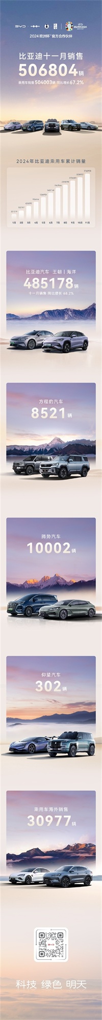 比亚迪继续领跑新能源汽车市场,11月份新能源汽车销量达到50.68万辆,同比大幅增长,进一步巩固了其在新能源汽车市场的领先地位。