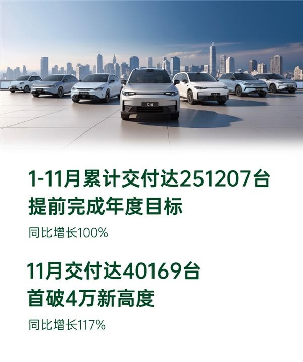 零跑汽车11月新车交付量约4.02万辆,同比增长117%,单月销量首次突破4万辆。1~11月,零跑汽车累计销量约25.12万辆,已提前完成此前设置的25万辆年销目标。2025年,零跑汽车将向50万辆的年度销量目标发起挑战。