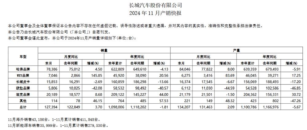 长城汽车11月总销量为12.7万辆,较去年同期的12.3万辆增长4%。