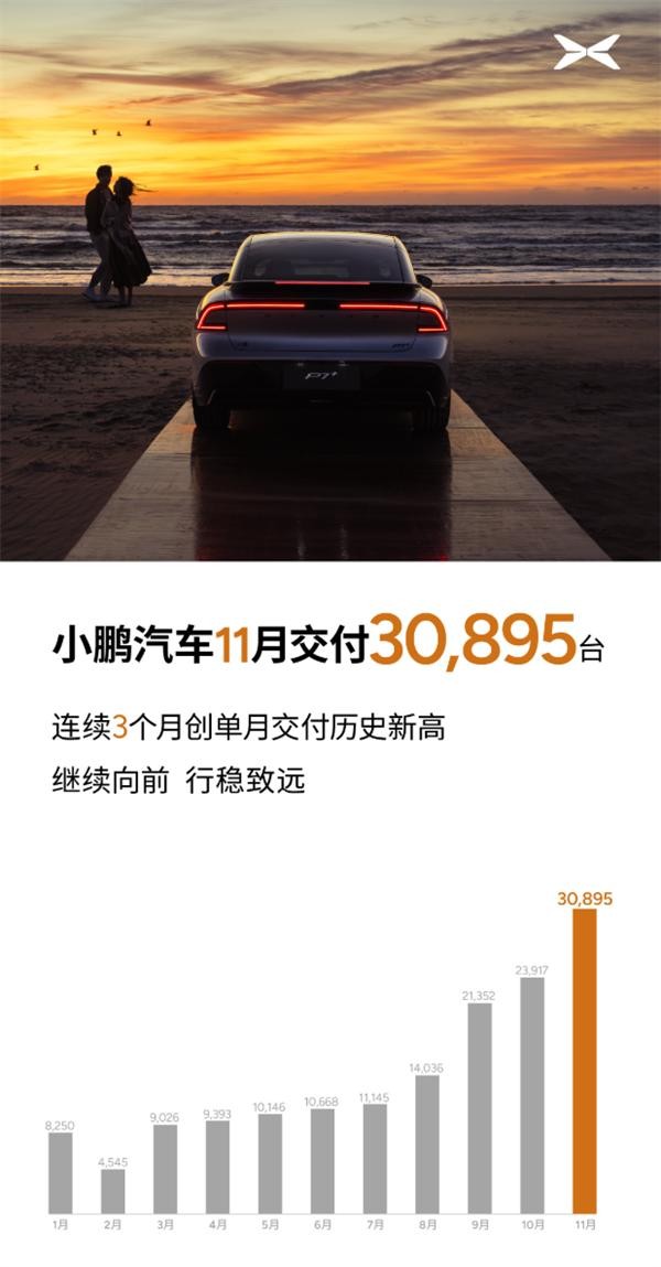 11月,小鹏汽车当月共交付新车约3.09万辆,同比增长54%。这是小鹏汽车单月交付量首次突破3万辆大关,同时也连续第三个月刷新了单月交付纪录。1~11月,小鹏汽车累计交付新车约15.34万辆,同比增长26.25%。