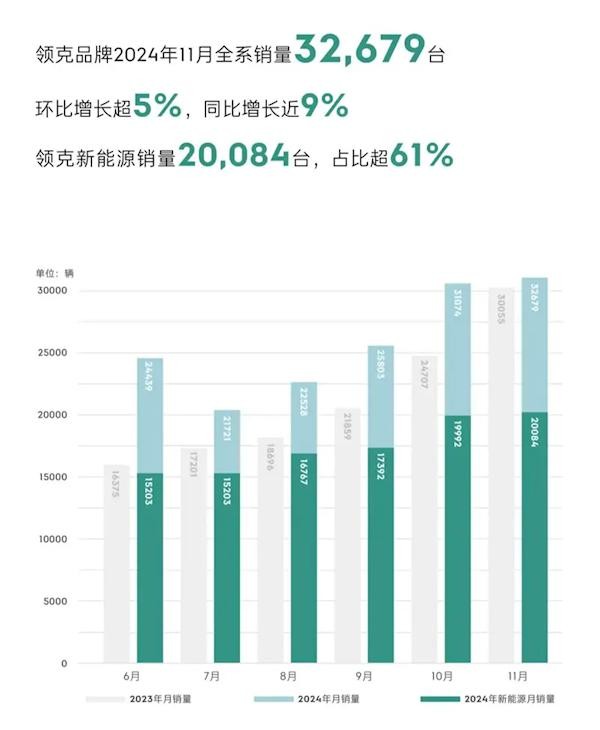 领克汽车11月销量数据出炉,全系销量达到32679台,同比增长近9%,环比增长超5%,创下历史新高。新能源车型销量尤为突出,达到20084台,占总销量的61%以上。今年1-11月,领克累计销量达259356台,累计销量已超过131万台。